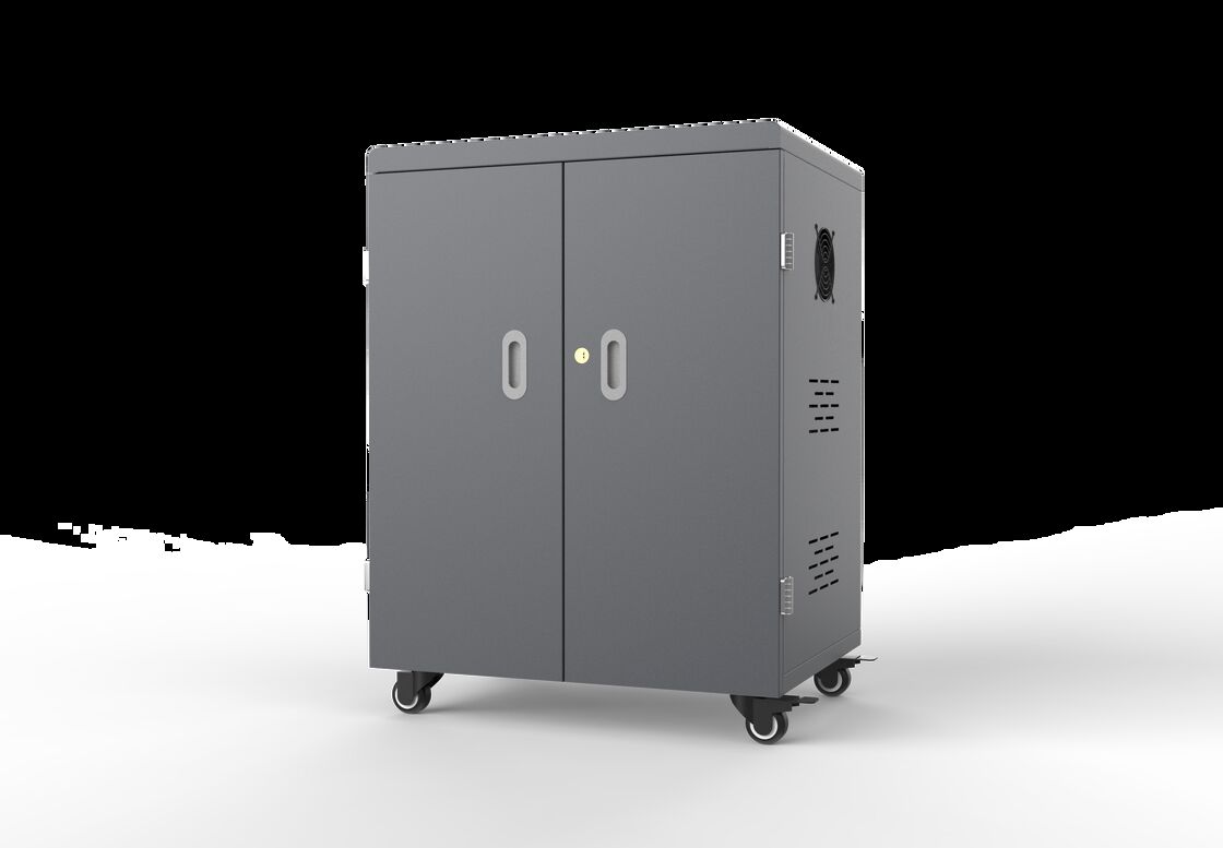 Le chariot de recharge à 54 ports USB possède deux portes avant (fermées par une serrure de sécurité) pour accéder au compartiment des appareils et deux portes arrière (fermées par une serrure de sécurité) pour accéder au département d'alimentation. Le chariot est facile à utiliser et à déplacer avec quatre roues universelles ultra-silencieuses de norme médicale allemande, dont deux avec frein.